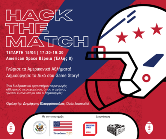 Με την καθοδήγηση του δημοσιογράφου (data journalist) Δημήτρη Ελαφρόπουλου, οι συμμετέχοντες θα έρθουν σε επαφή και θα μάθουν για τα Αμερικανικά αθλήματα (όπως το flag football, το baseball, το lacrosse, κ.ά.), θα εξοικειωθούν στην παραγωγή δημοσιογραφικού περιεχομένου με την αξιοποίηση δεδομένων και θα δημιουργήσουν το δικό τους αθλητικό περιεχόμενο. Η δράση υλοποιείται με την υποστήριξη της Πρεσβείας των Η.Π.Α. στην Αθήνα στο πλαίσιο των εορτασμών για την 250η Επέτειο της Αμερικανικής Ανεξαρτησίας και θα πραγματοποιηθεί στη Δημόσια Κεντρική Βιβλιοθήκη της Βέροιας.