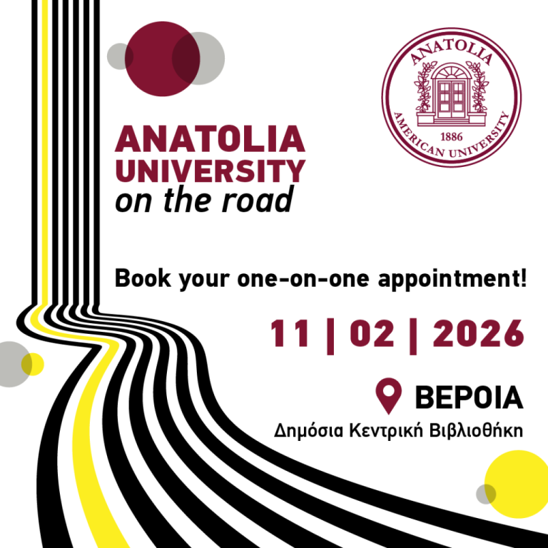 📍 Το Anatolia American University επισκέπτεται τη Βέροια και σας προσκαλεί να κλείσετε ένα 20λεπτο one-on-one meeting με εκπρόσωπο του Γραφείου Εισαγωγής Φοιτητών, ώστε να ενημερωθείτε εξατομικευμένα για τις προπτυχιακές σπουδές στη Θεσσαλονίκη.