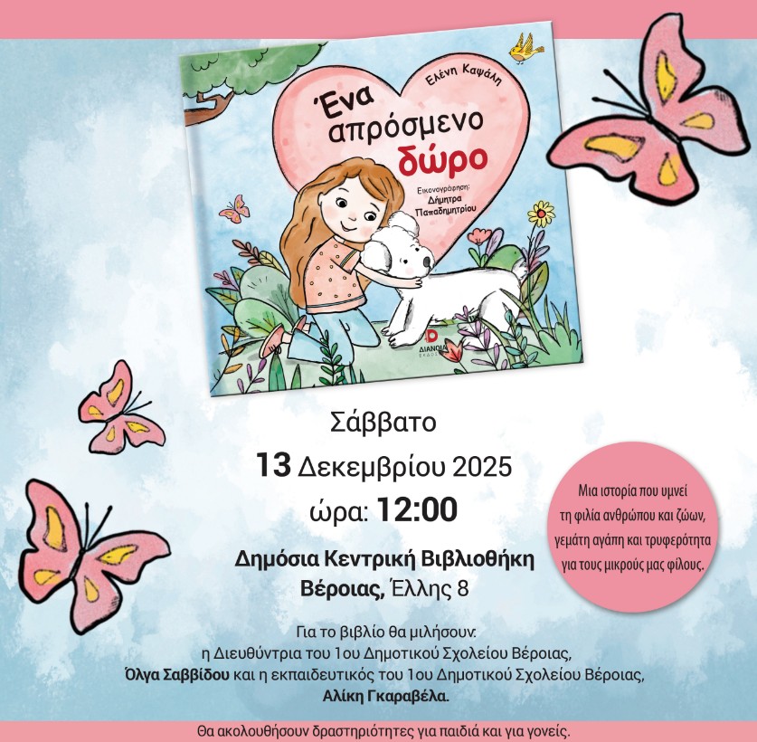 Το Σάββατο 13 Δεκεμβρίου, στις 12:00 το μεσημέρι, η εκπαιδευτικός Ελένη Καψάλη θα παρουσιάσει το νέο της παιδικό βιβλίο με τίτλο «Ένα απρόσμενο δώρο» που κυκλοφορεί από τις εκδόσεις ΔΙΑΝΟΙΑ, στη Δημόσια Κεντρική Βιβλιοθήκη Βέροιας.