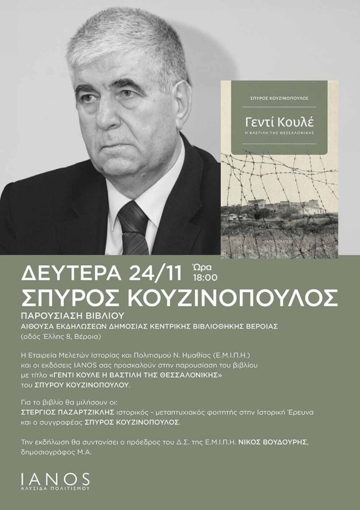 Η Εταιρεία Μελετών Ιστορίας και Πολιτισμού Ν. Ημαθίας (Ε.Μ.Ι.Π.Η.) και οι εκδόσεις IANOS παρουσιάζουν στην Βέροια το νέο βιβλίο του Σπύρου Κουζινόπουλου, με τίτλο: «Γεντί Κουλέ – Η Βαστίλη της Θεσσαλονίκης».