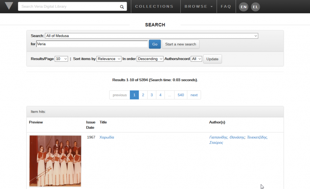 In the digital Repository “Medusa” you can search out by giving the key words in the corresponding field on the top left part of the page.