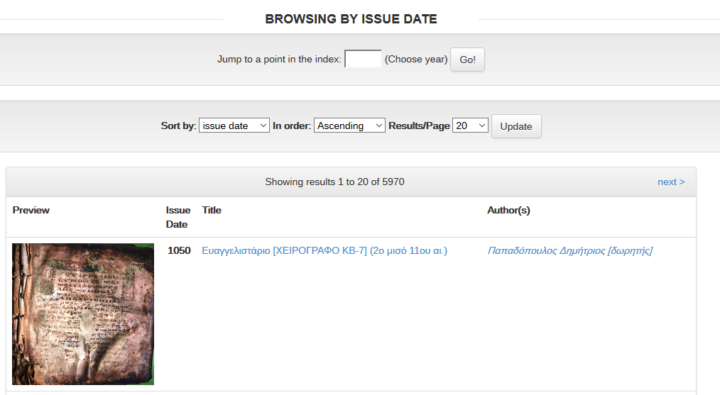 From the option BROWSING BY DATE OF ISSUE you can choose the date of issue of the item and change the arrangement of the results on the basis of :